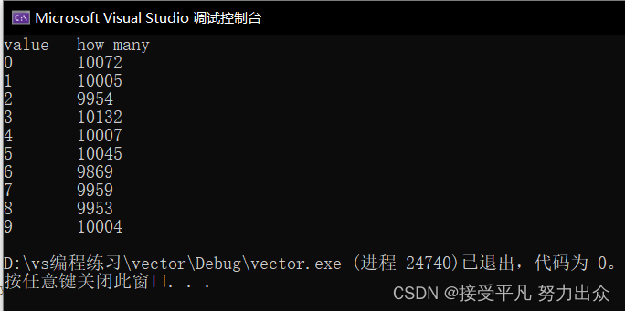 看起来很随机了,但随机性如何?分布的均匀吗?所谓均匀分布,应该每个数出现的概率都是一样的。在上面的20个结果中,6出现了5次,而4和8一次也没出现。但这并说明不了什么,毕竟我们的样本太少了,才20个数,如果足够的,比如说1000000个数,统计一下其中的数字才能去说明问题。但总不能都把这些数打印出来挨个去数吧。我们需要写一个函数统计每个数字出现的次数。完整的程序如下:
