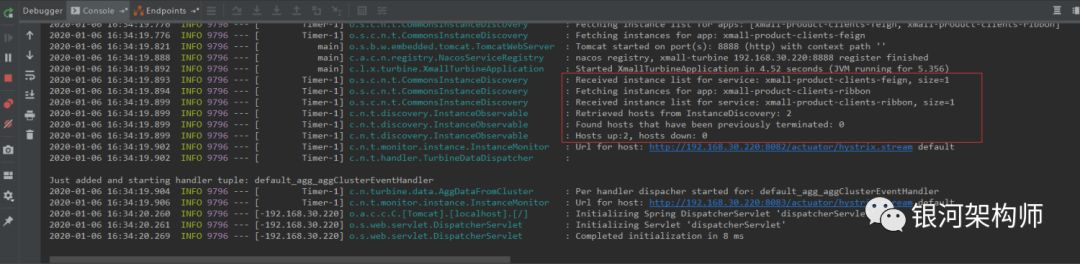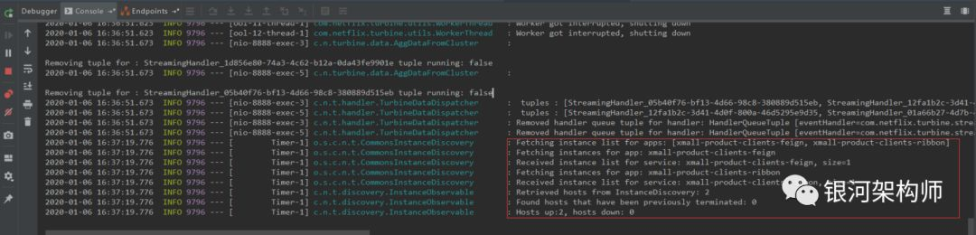 查看控制台,发现turbine框架会定时从注册中心拉取服务信息,并刷新数据。