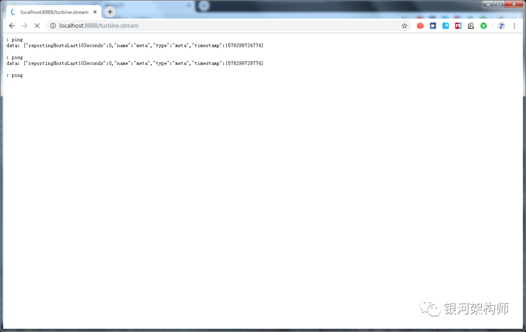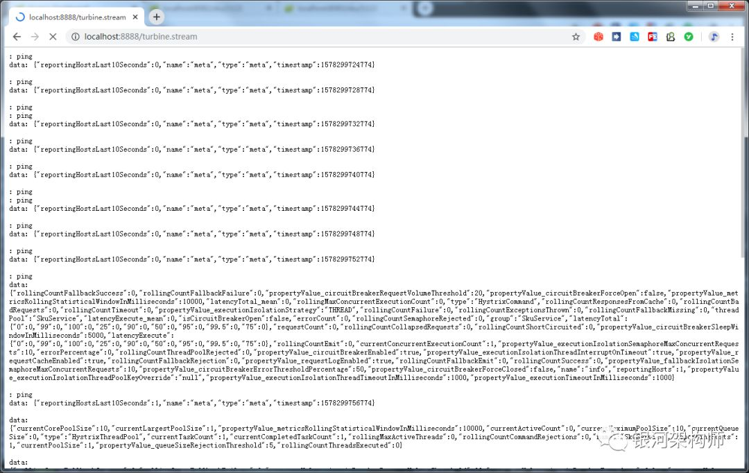 访问turbine.stream,如同hystrix.stream一般,依然是一连串的ping。