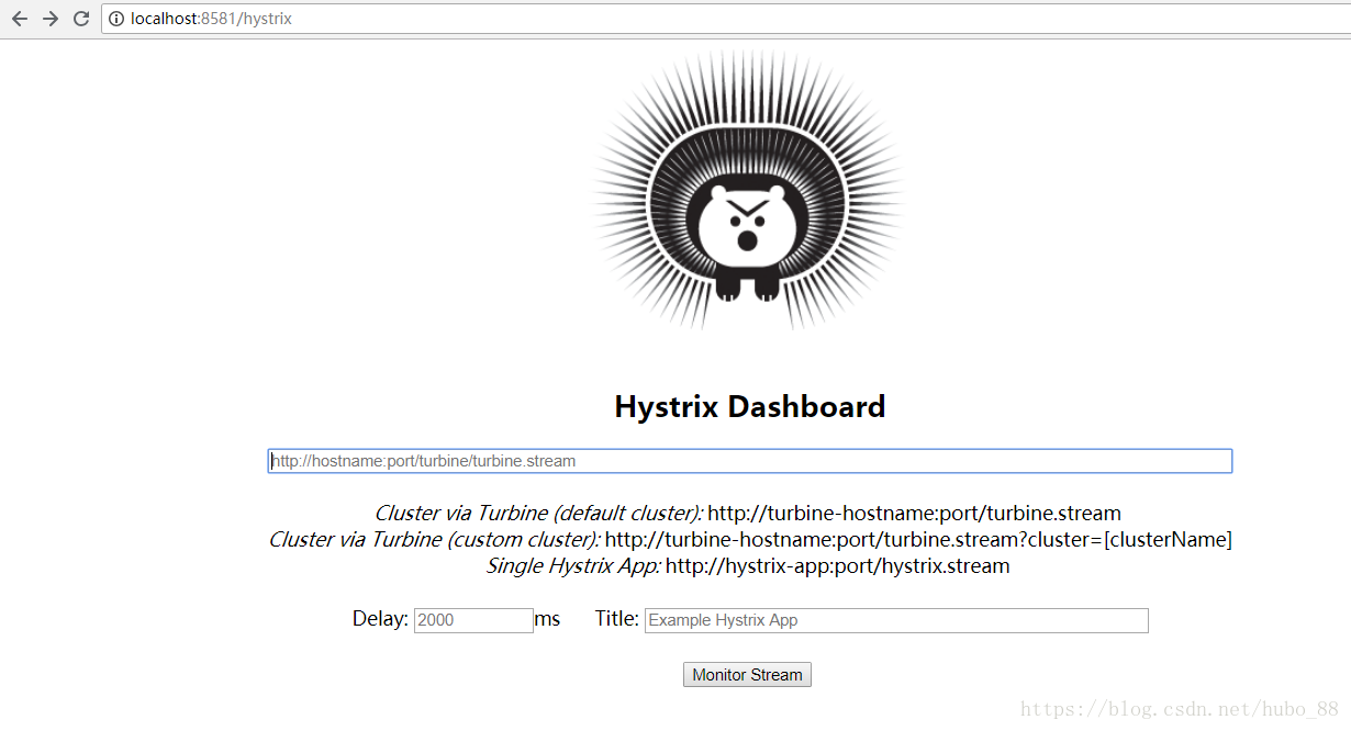 5. 依次启动 eureka server、spring-demo-service、spring-demo-service-feign、spring-demo-service-ribbon、spring-demo-service-ribbon、spring-cloud-hystrix-dashboard-turbine,访问 http://localhost:8581/hystrix,界面和 Hystrix Dashboard 的界面一致
