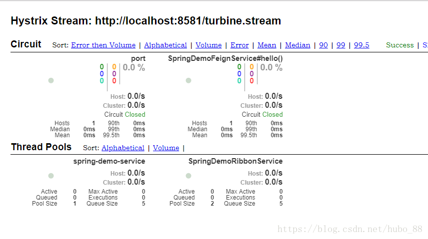 可以看到 spring-demo-service-ribbon 和 spring-demo-service-feign 两个服务的 Hystrix Dashboard 的数据已经被聚合到这一个界面中。