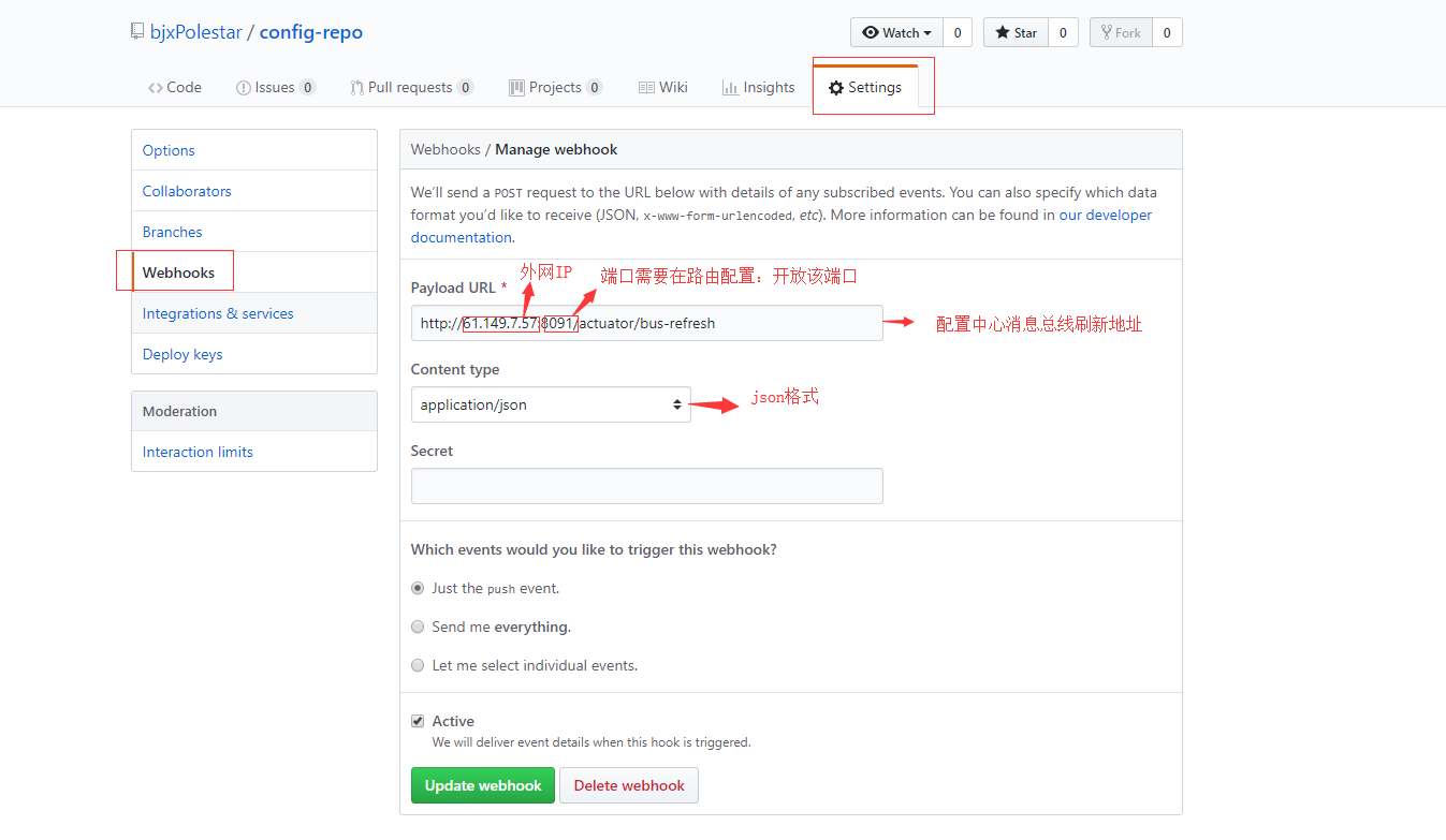 注意坑:Payload URL需要设置成外网访问的地址,之前设置成了内网的IP地址,一直不通(需要进行内网穿透)。