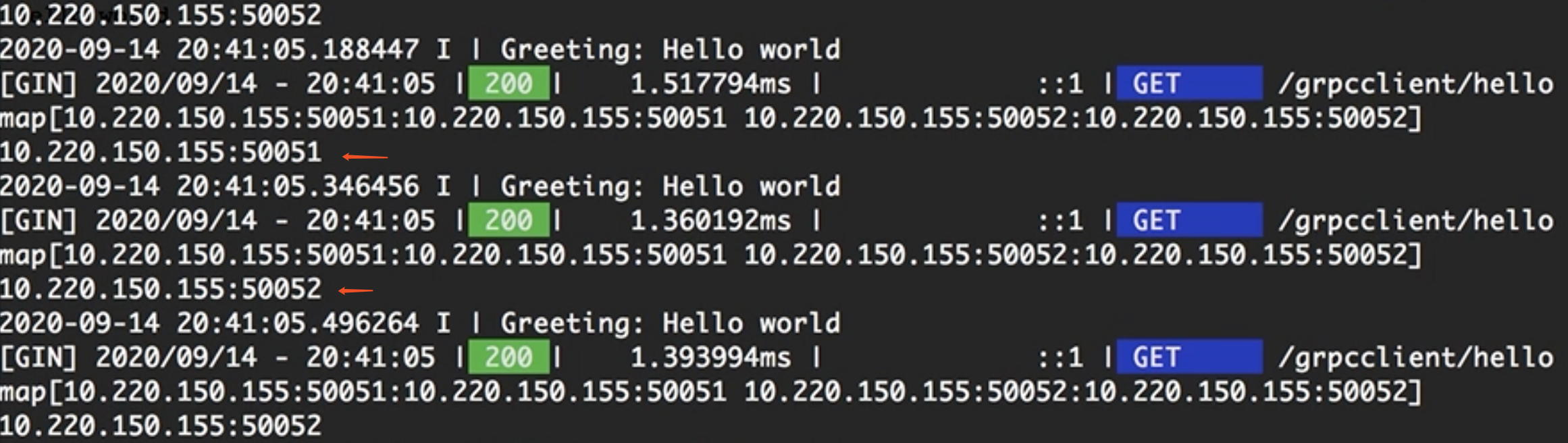 5. 调用服务,可以发现,请求会分别发送到端口50051和50052上