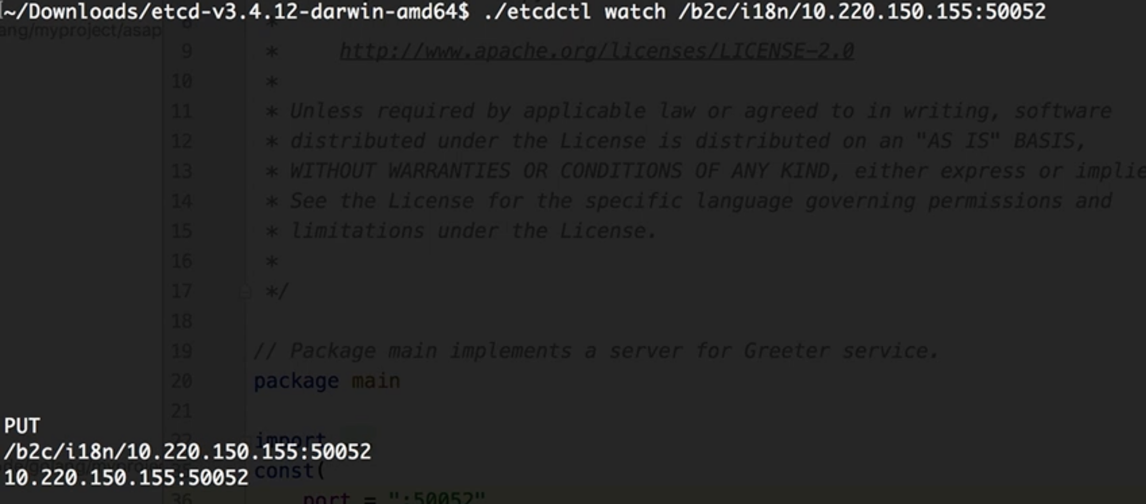 - 启动另一个被调用服务,端口号为50052,该服务也会被注册到ETCD上,调用者通过watch能发现两个服务