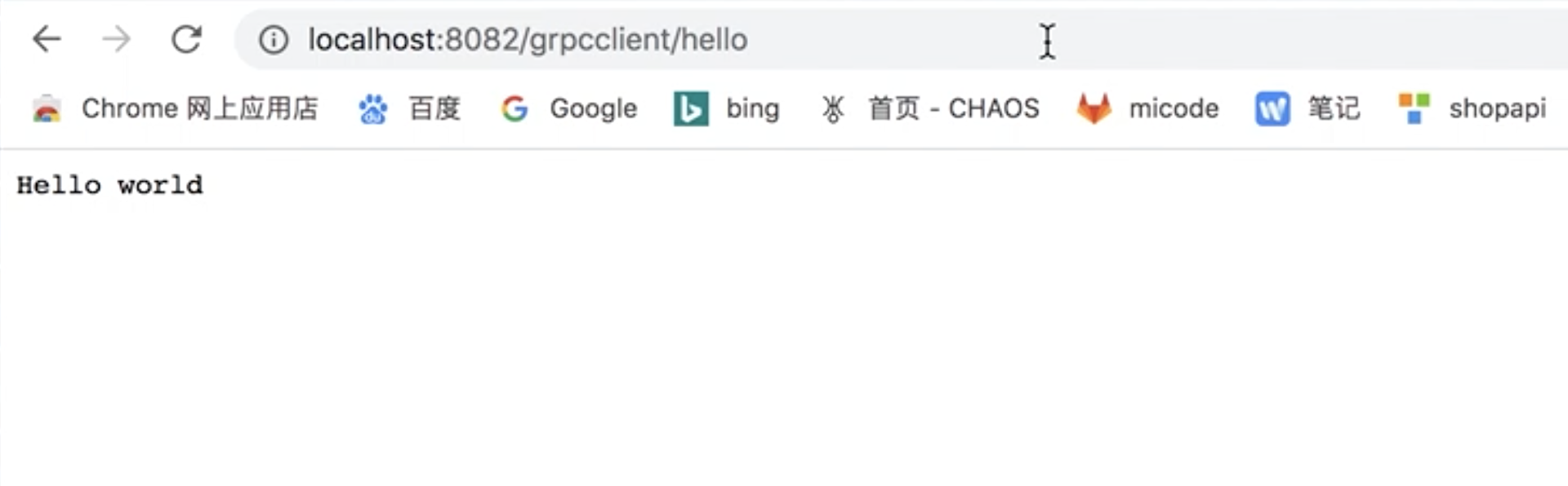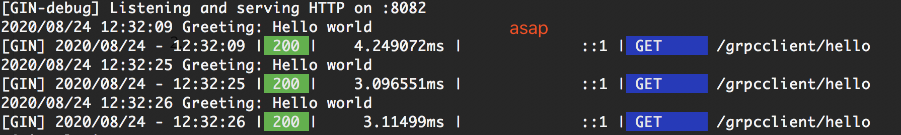 package grpcclient import ( "github.com/gin-gonic/gin" "google.golang.org/grpc" "net/http" "os" "time" pb "asap/lib/helloworld" "log" "context" ) const ( address = "localhost:50051" defaultName = "world" ) func Hello(contextGin *gin.Context) { // Set up a connection to the server. conn, err := grpc.Dial(address, grpc.WithInsecure(), grpc.WithBlock()) if err != nil { log.Fatalf("did not connect: %v", err) } defer conn.Close() c := pb.NewGreeterClient(conn) // Contact the server and print out its response. name := defaultName if len(os.Args) > 1 { name = os.Args[1] } ctx, cancel := context.WithTimeout(context.Background(), time.Second) defer cancel() r, err := c.SayHello(ctx, &pb.HelloRequest{Name: name}) if err != nil { log.Fatalf("could not greet: %v", err) } log.Printf("Greeting: %s", r.GetMessage()) contextGin.String(http.StatusOK, r.GetMessage()) }
