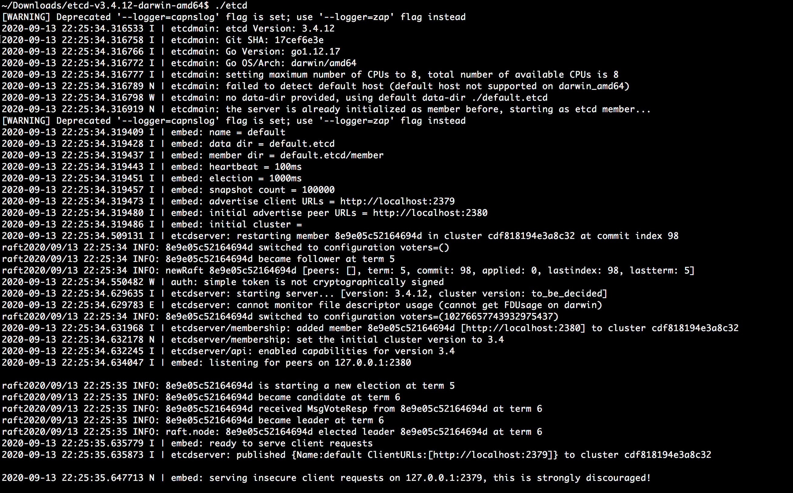 进到文件,执行./etcd开启etcd服务,只不过不是集群的