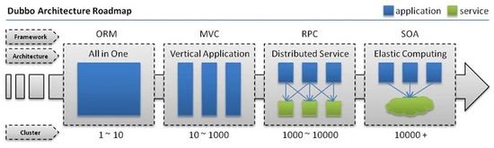 垂直应用系统架构的改进,当垂直应用越来越多,应用之间交互不可避免,将核心业务抽取出来,作为独立的服务,逐渐形成稳定的服务中心,使前端应用能更快的响应多变的市场需求。此时,用于提高业务复用及整合与管理各服务互相协作的分布式服务框架(RPC)是关键。