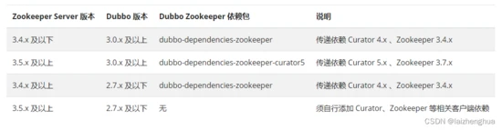 注意:官方明确指出 Dubbo 和 dubbo-dependencies-zookeeper 有版本兼容性问题,如使用中遇到版本兼容问题,也可以不使用 dubbo-dependencies-zookeepe r,而是自行添加 Curator、Zookeeper Client 等依赖,例如: