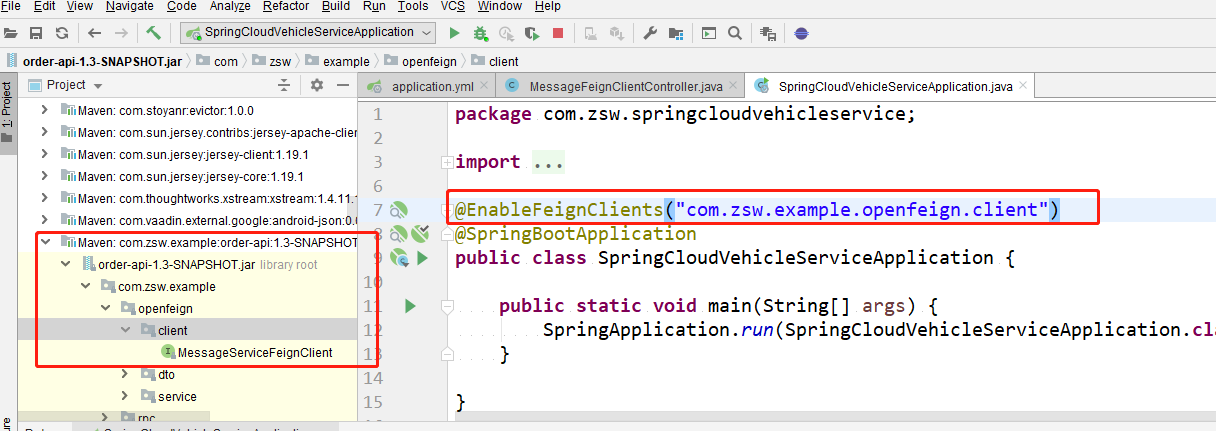 5. 启动类加上注解,开启feignClient并且扫描指定包路径,注意包路径是引用的client路径