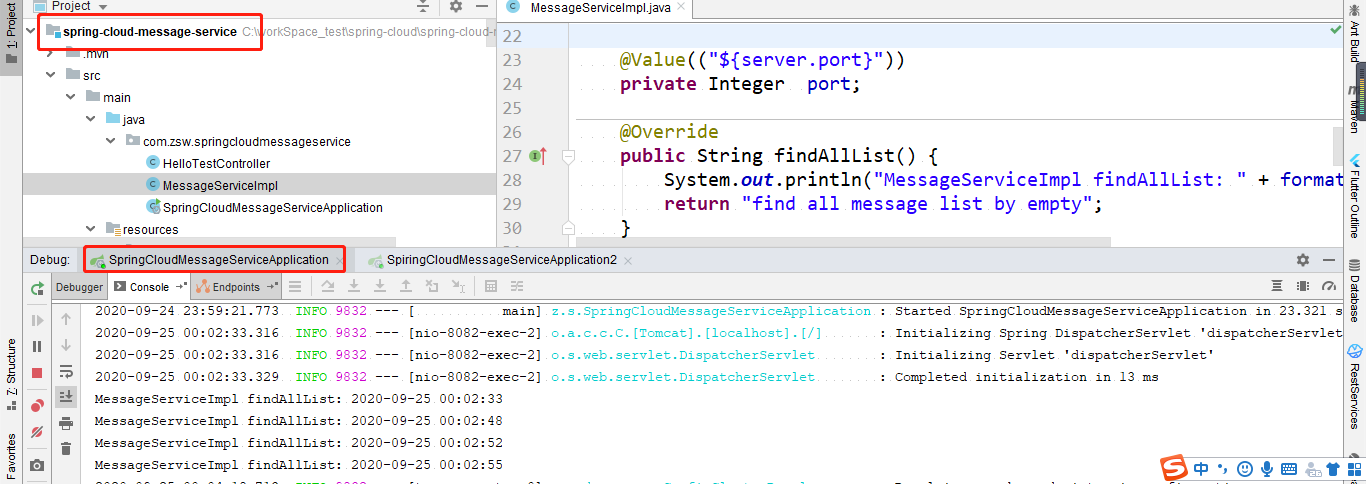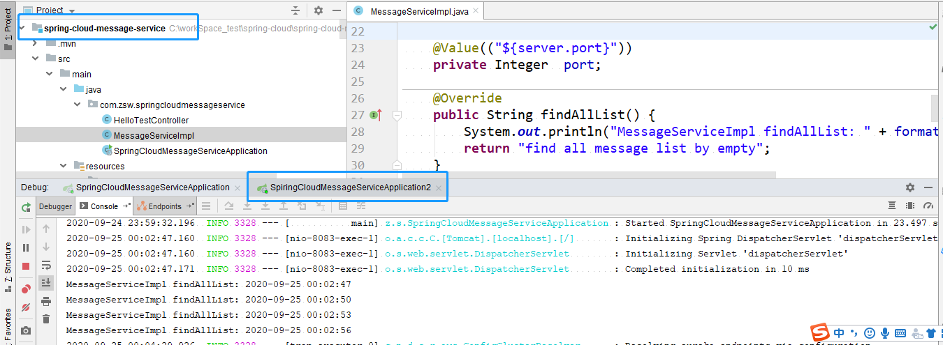 2. 启动服务提供方项目spring-cloud-message-service(两次两个端口的启动做成集群)