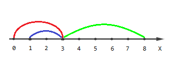 Points with coordinates [0,4,5,6,7,8][0,4,5,6,7,8] are covered by one segment, points [1,2][1,2] are covered by two segments and point [3][3] is covered by three segments.