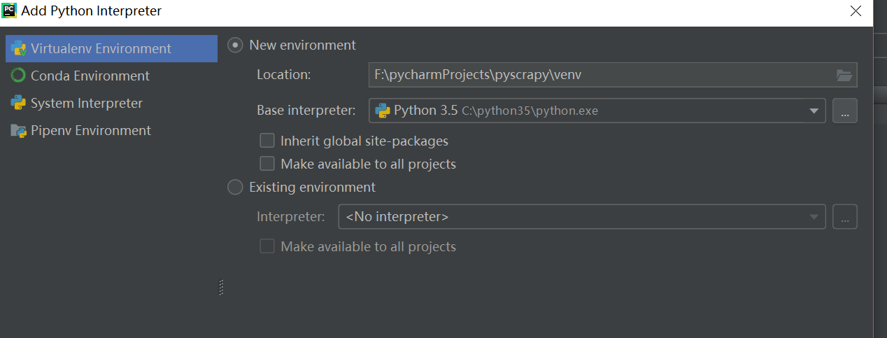 利用pycharm生成项目,但没有独立的虚拟环境时,想要生成一个时,可以利用pycharm自带的工具来生成。