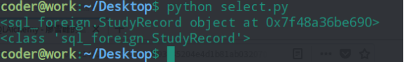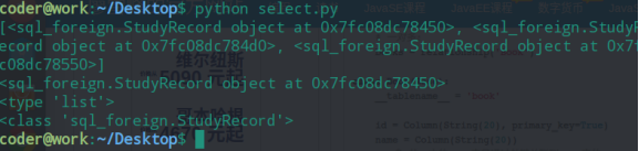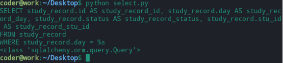 1 #coding:utf-8 2 3 from sqlalchemy.orm import sessionmaker 4 from sqlalchemy import create_engine 5 from sql_foreign import Student,StudyRecord 6 7 8 engine = create_engine("mysql+mysqldb://root:123@localhost:3306/test",) 9 Session_class = sessionmaker(bind=engine) 10 session = Session_class() 11 12 stu_obj = session.query(StudyRecord).filter_by(id = 100).first() 13 #stu_obj = session.query(StudyRecord.id,StudyRecord.day).all() 14 #stu_obj = session.query(StudyRecord).all() 15 #print(stu_obj.student.id) #获取study_record的数据 16 #print(stu_obj.student.name) #获取study_record的数据 17 #print(stu_obj.student.register_day) #获取study_record的数据 18 19 print stu_obj 20 print type(stu_obj)