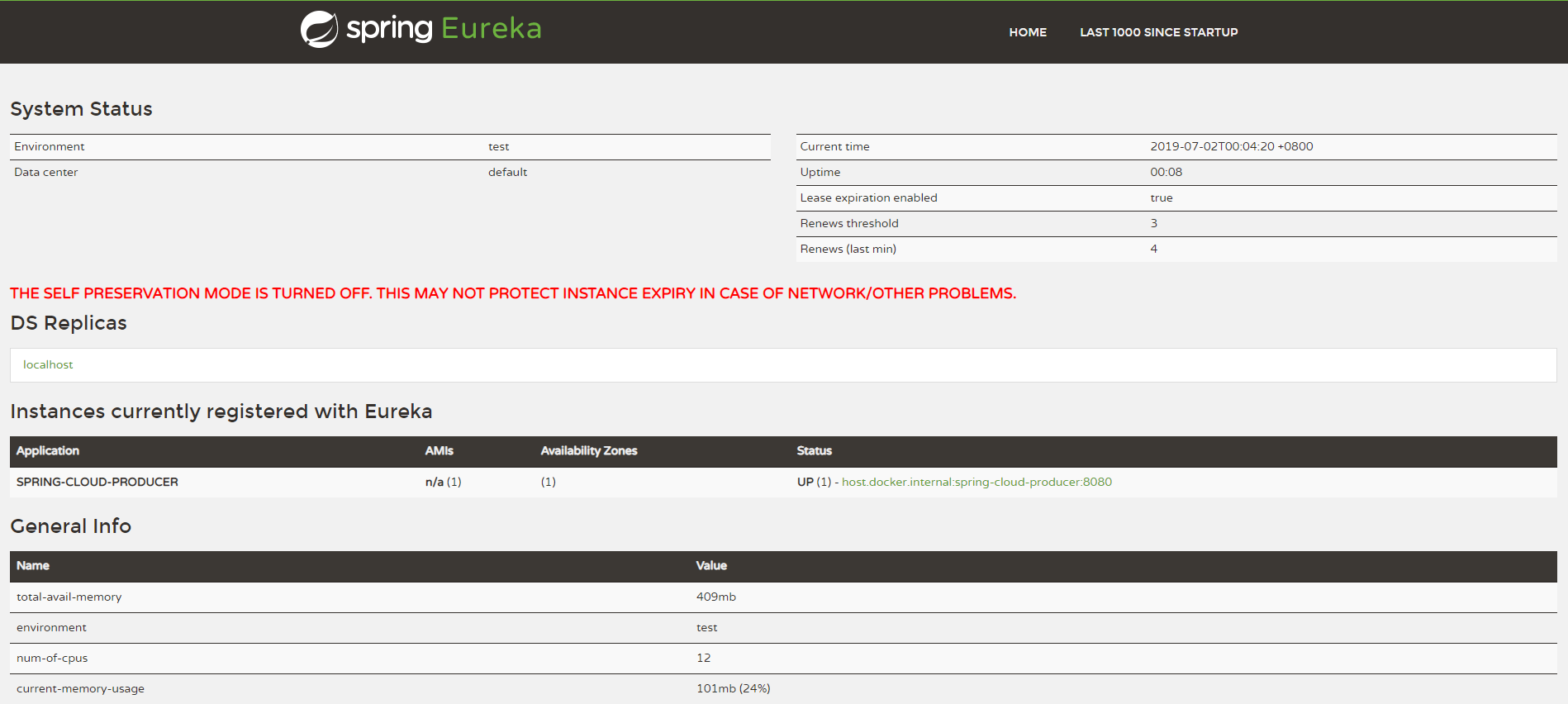 先在可以先启动上一篇当中单机版的Eureka,再启动我们刚写好的producer服务提供者,启动成功后,访问链接http://localhost:8761/,可以看到我们的的服务提供者producer已经成功注册在注册中心上了。