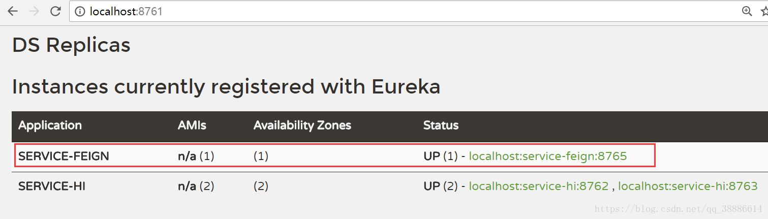 eureka.client.service-url.defaultZoon=http://localhost:8761/eureka server.port=8765 spring.application.name=service-feign