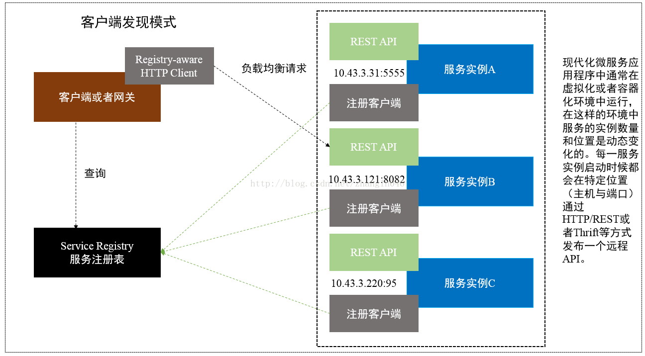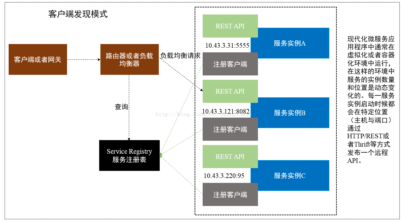 它的主要特点是客户端决定服务实例的网络位置,并且对请求进行负载均衡。客户端查询服务注册表(可用服务实例数据库),使用负载均衡算法选择一个实例,并发出请求。典型代表Eureka或者ZK