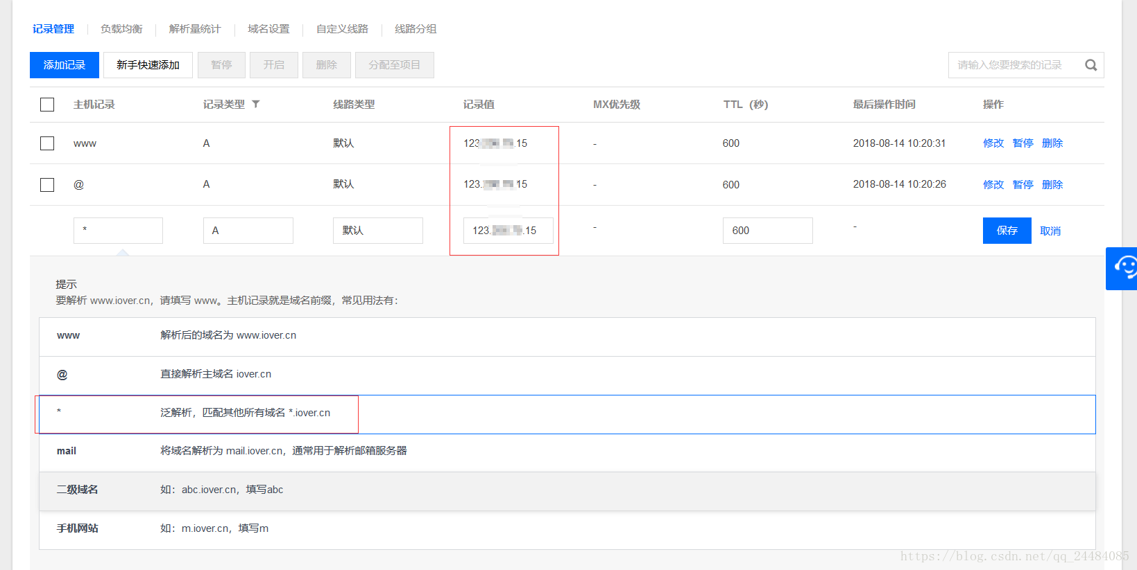 一定要添加一条主机记录为* 的这样我们才能通过 *.域名.com *为任意值 访问到应用。 记录值为服务器的公网IP