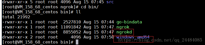 说明:ngrokd是Linux服务端的启动程序,下面windows_amd64 是保存的windows 64位的客户端启动程序,需要将此拷贝到本地电脑。