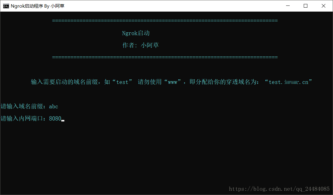 Echo 输入需要启动的域名前缀,如“test” 请勿使用“www”,即分配给你的穿透域名为:“test.example.cn”