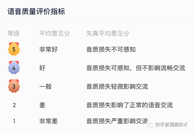 平均意见分 Mean Opinion Scores(MOS):近段单讲(ST NE)采用MOS主观打分形式,分数定义如下图,评委们根据自己的主观感受进行打分后取平均值作为总分;