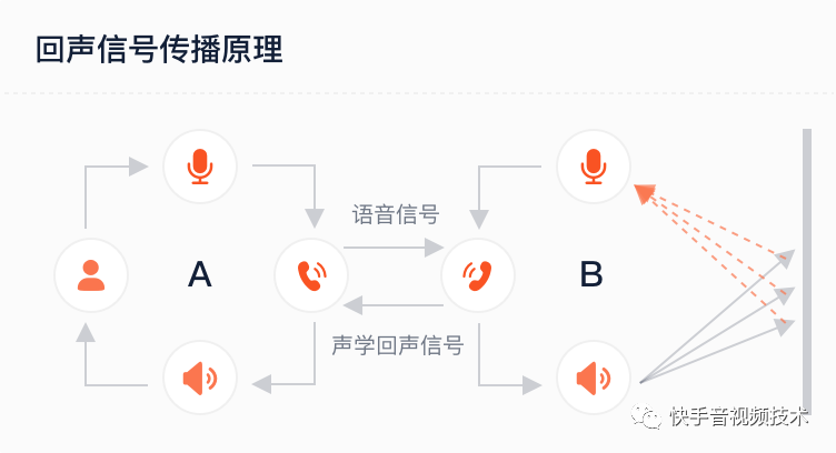 在实时音视频通信中,回声产生的本质是扬声器播放的声音被麦克风再次收录,如果通话双方同时开着麦克风,A的声音从B的扬声器播放并被B的麦克风收录,再传回A并从扬声器播出,就会产生回声。
