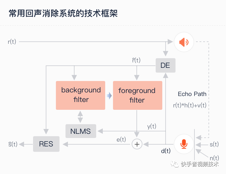 下图粗略地描述了常用回声消除系统的技术框图。其中,DE是延时估计模块;NLMS是自适应滤波器估计算法;background filter和foreground filter是为了更加稳定地估计滤波器系数而存在的设计;RES是残留回声抑制模块。