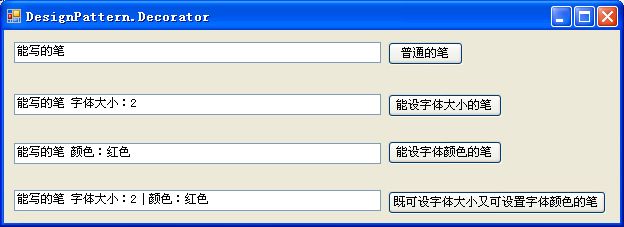 通过共性的抽象和一系列的新功能职责的装饰,新的设计应运而生,现在如果我们需要扩展出一种新的笔种,要求出了具备基本的写行为之外,还同时带有可设置字体大小和字体颜色的功能。显然,我们之前的设计就派上了用场,这时我们只需要通过聚合的方法就能够组合成这一种新的角色(笔种)出来。很明显应用了Decorator让设计变得更加灵活,同时也说明了一个问题,在我们实际的设计中,应少用继承多,尽量的通过聚合的方法来设计,提高设计灵活度。