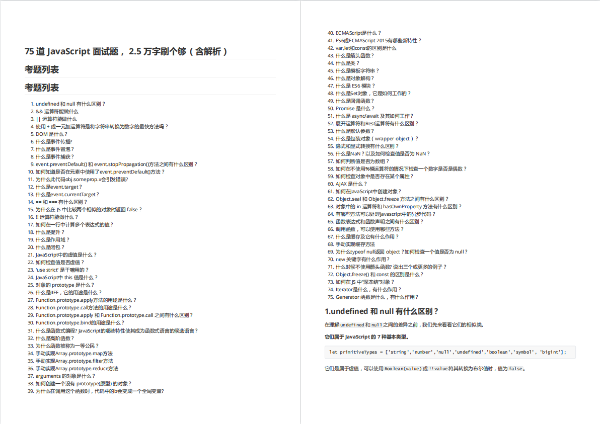 整理了75个JS高频面试题,并给出了答案和解析,基本上可以保证你能应付面试官关于JS的提问。