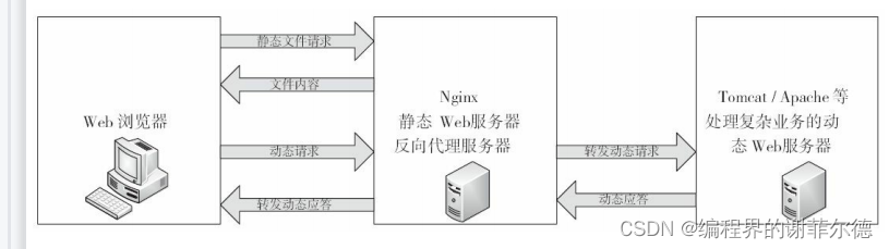 由于Nginx具有“强悍”的高并发高负载能力,因此一般会作为前端的服务器直接向客户提供静态文件服务。但也有一些复杂、多变的业务不适合放到Nginx服务器上,这时会用pache、Tomcat等服务器来处理。于是,Nginx通常会被配置为既是静态Web服务器也是反向理服务器,不适合Nginx处理的请求就会直接转发到上游服务器中处理。