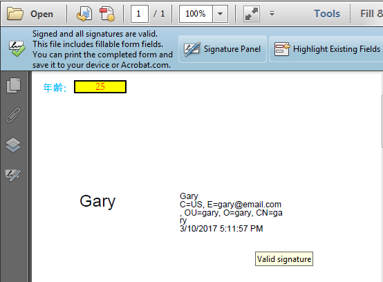 //加载PDF文档 PdfDocument pdf = new PdfDocument(); pdf.LoadFromFile("Fields.pdf"); //获取第一页 PdfPageBase page = pdf.Pages[0]; //获取文档的所有域 PdfFormWidget form = pdf.Form as PdfFormWidget; //填充第一个文本域 PdfTextBoxFieldWidget textboxField = form.FieldsWidget[0] as PdfTextBoxFieldWidget; textboxField.Text = "25"; //填充第二个签名域 PdfSignatureFieldWidget signatureField = form.FieldsWidget[1] as PdfSignatureFieldWidget; String pfxPath = @"gary.pfx"; PdfCertificate digi = new PdfCertificate(pfxPath, "123456"); PdfSignature signature = new PdfSignature(pdf, page, digi, "demo", signatureField); signature.IsTag = true; signature.DigitalSigner = "Gary"; signature.ConfigGraphicType = ConfiguerGraphicType.TextSignInformation; //保存文档 pdf.SaveToFile("Fill.pdf");