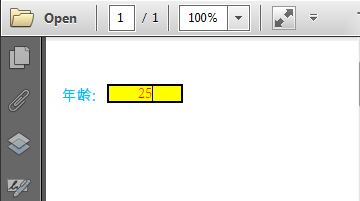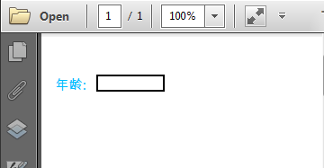 //创建PDF文档 PdfDocument pdf = new PdfDocument(); //添加一个新页面 PdfPageBase page = pdf.Pages.Add(PdfPageSize.A4, new PdfMargins()); //添加文本到页面 PdfTrueTypeFont font = new PdfTrueTypeFont(new Font("Arial Unicode MS", 10f), true); page.Canvas.DrawString("年龄:", font, PdfBrushes.DeepSkyBlue, 10, 50); //创建文本域并指定文本域的名称 PdfTextBoxField textbox = new PdfTextBoxField(page, "Age"); //设置文本域的大小、位置、字体 textbox.Bounds = new RectangleF(40, 50, 50, 12); textbox.Font = font; //添加文本域到文档 pdf.Form.Fields.Add(textbox); //保存文档 pdf.SaveToFile("Fields.pdf");
