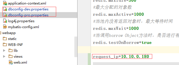 <!--请求的ip--> <bean class="java.lang.String" id="requestId"> <constructor-arg type="java.lang.String" value="${request_ip}"/> </bean> <!--开发环境--> <beans profile="dev"> <context:property-placeholder location="classpath*:dbconfig-dev.properties" /> </beans> <!--生产环境--> <beans profile="pro"> <context:property-placeholder location="classpath*:dbconfig-pro.properties" /> </beans>