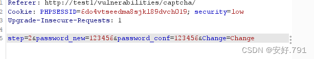 可以看到,Medium级别的代码在第二步验证时,参加了对参数passed_captcha的检查,如果参数值为true,则认为用户已经通过了验证码检查,然而用户依然可以通过伪造参数绕过验证,本质上来说,这与Low级别的验证没有任何区别。