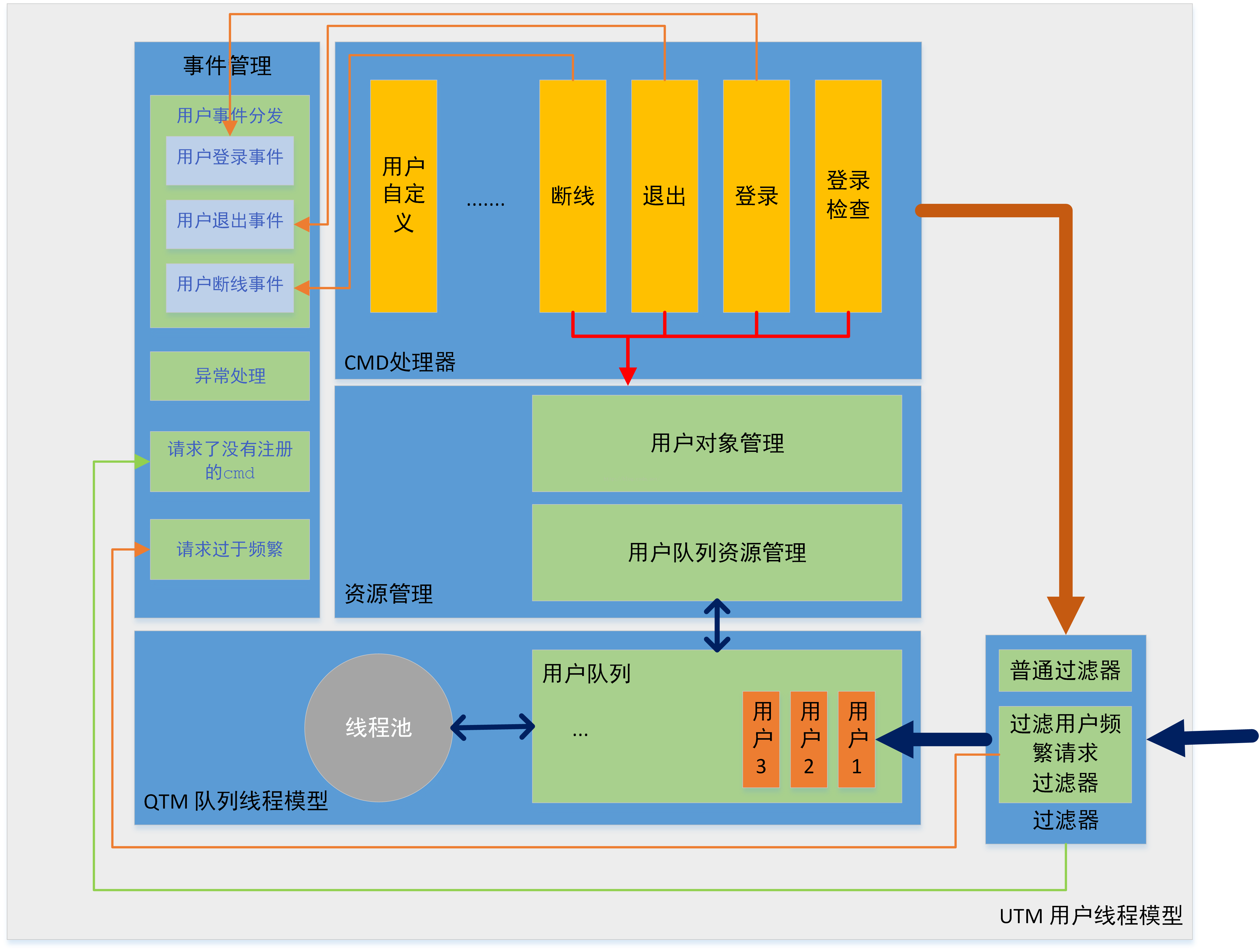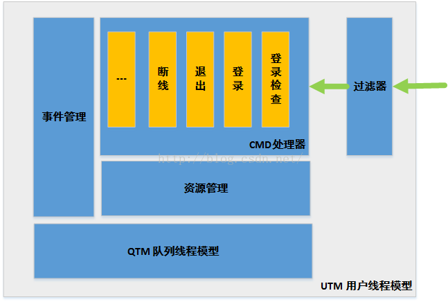 CMD处理器:在utm中用户请求、用户登录、用户退出、用户断线都被封装成一个cmd请求(每个用户请求都包含两部分内容:1.cmd(所要请求的处理器名) 2.请求参数)。Utm提供了基本的用户生命流程事件,并处理了其中相关的流程逻辑,我们只需要专注于处理各个事件中的业务逻辑;我们可以根据需要定义自己的cmd处理器。