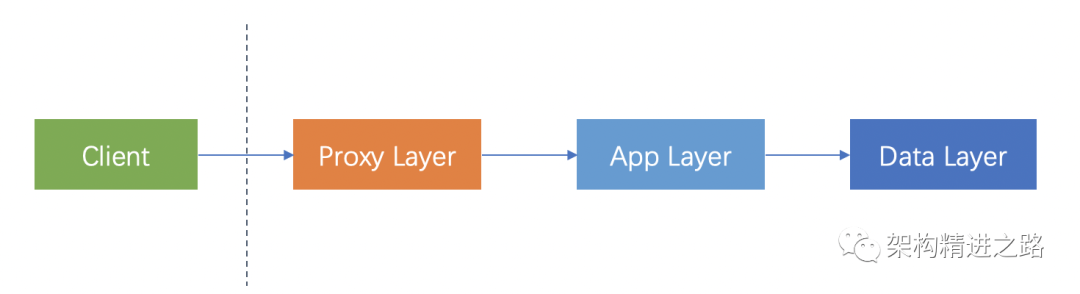 请求从客户端发出,到达Proxy Layer(执行一些公共的逻辑,如逻辑、流控、审计等),完成后,发往App Layer(执行具体业务逻辑),执行完毕后,发向Data Laye(进行数据持久化)。