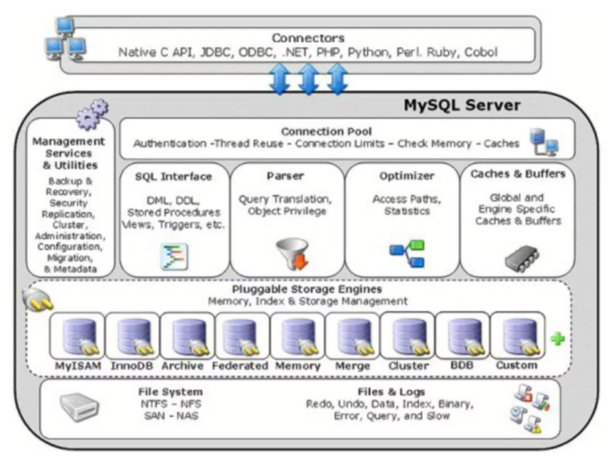 从以上的架构图我们可以看出,最上面的 Connectors 表示客户端,客户端就是一些具体的链接协议;下面的 MySQL Server 表示服务端,前端培训其中包括 Connection Pool 、SQL Interface、Parser、Optimizer、Storage Engines、文件系统(Files、Logs)以及管理服务。