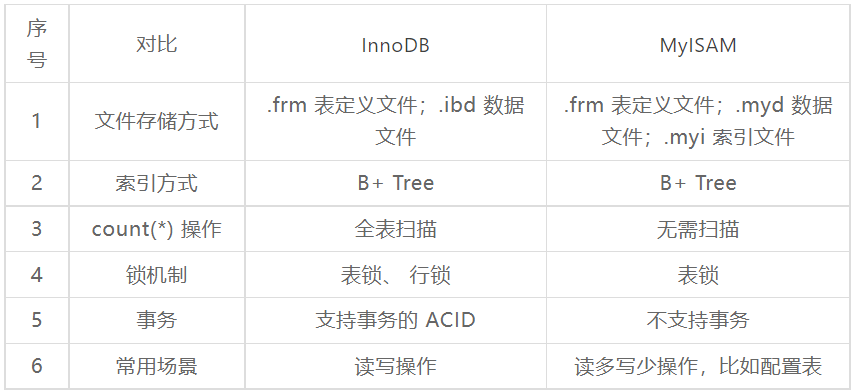 MyISAM 与 InnoDB 引擎主要有以下 6个方面的区别:
