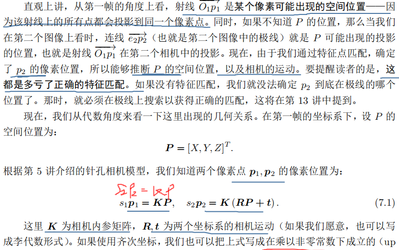 假设我们已经有了匹配好的特征点对,然后根据点对估计相机运动,优于相机的原理不同,情况发生了变化: