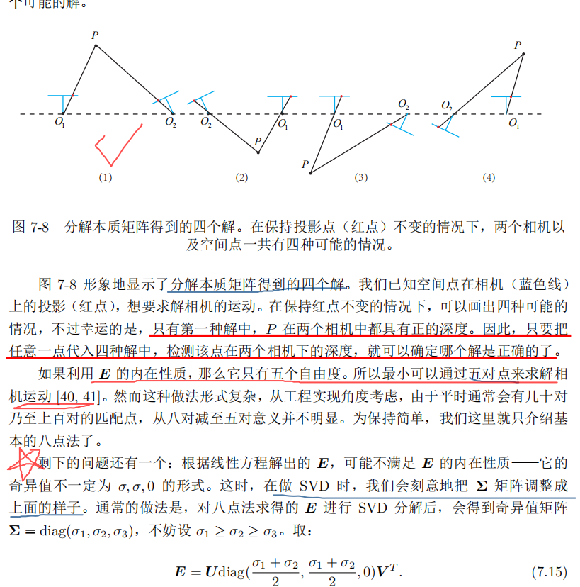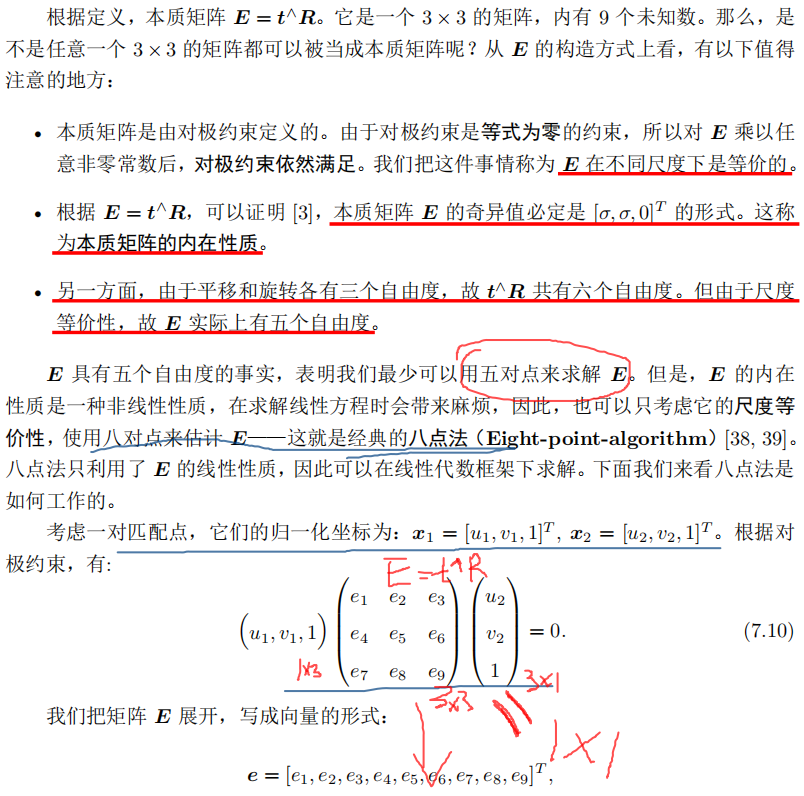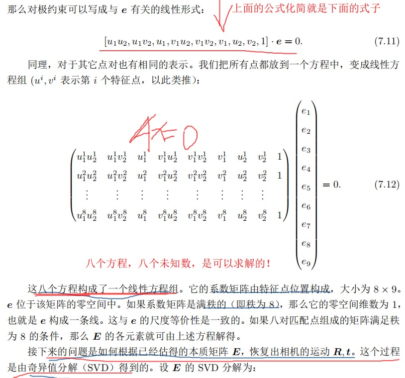 阵的自由度下降,这就出现了所谓的退化(degenerate)。现实中的数据总包含一些噪声,这时候如果我们继续使用八点法求解基础矩阵,