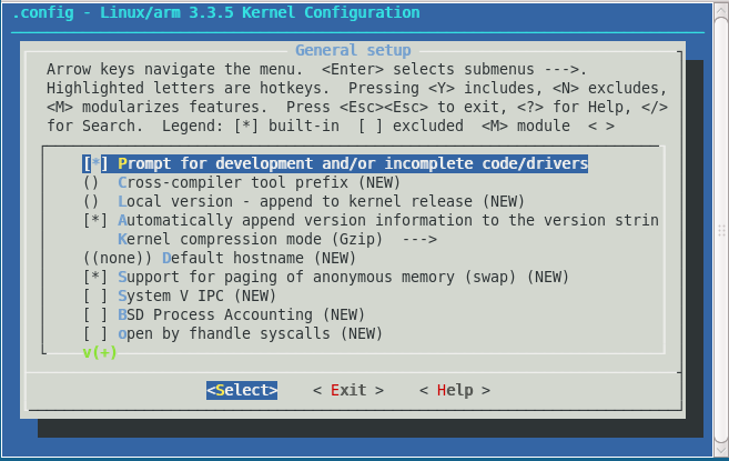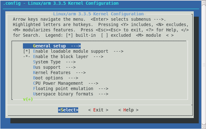把smdk210v板子的config文件拷过来了,进行内核编译。简单的说一下,咱们在这里的移植是属于板级的移植,一般来说移植操作系统分为:体系结构级的移植、soc级的移植和板级的移植。板级的移植是最简单的,往往是在芯片制作厂商提供的样板的基础上做移植。当然一般来说,这就够了。好吧,不扯了。在linux-3.3.5目录下,通过cp arch/arm/configs/s5pv210_defconfig .config 把对smdkv210板的配置文件拷贝到linux-3.3.5目录下,并且保存为.config文件。现在把配置文件拷贝过了,通过命令:make menuconfig 进入配置界面进行配置吧。进入后的界面为: