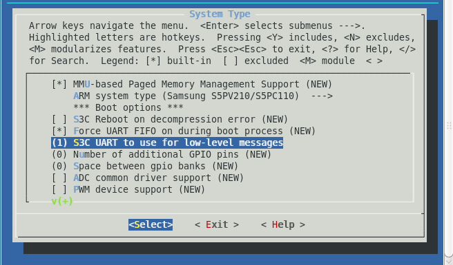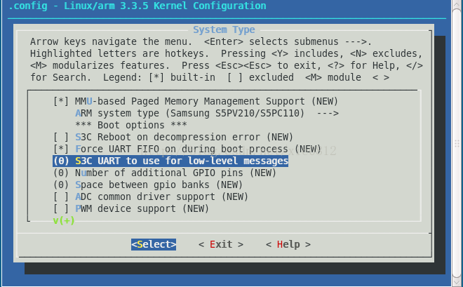 看到图中高亮的部分了,选中这个选项,把1改成0,为什么要改了,因为开发板上是用UART0输出信息的,如果不修改,会在启动内核的时候,无法显示信息。也就是在 Start kenel....之后不显示信息的缘故。修改后的效果图为: