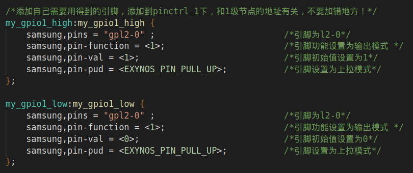 samsung,pin-function = <1>; /*引脚功能设置为输出模式 */