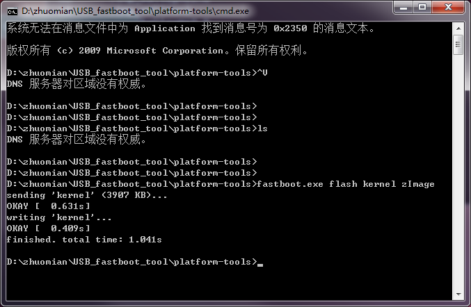 a.输入烧写 zImage 内核命令“fastboot.exe flash kernel zImage”