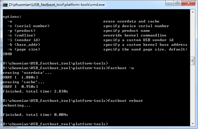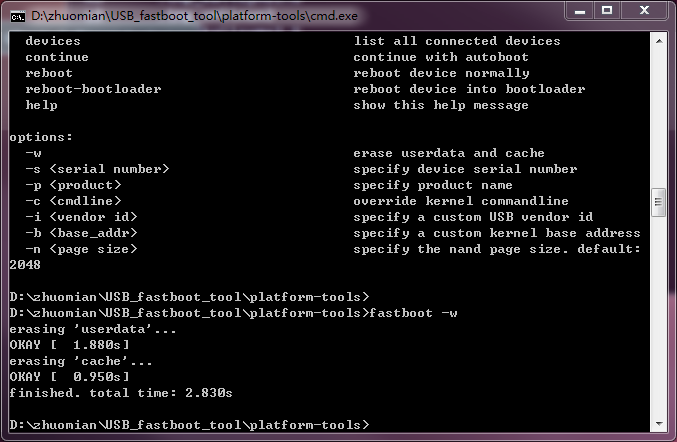 2. 输入擦除命令“ fastboot -w ” (abc 烧写完之后输入此命令)