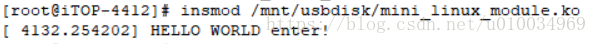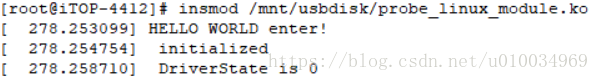 将ko文件复制到开发板,使用insmod装载驱动,可以看到执行了驱动中的函数:
