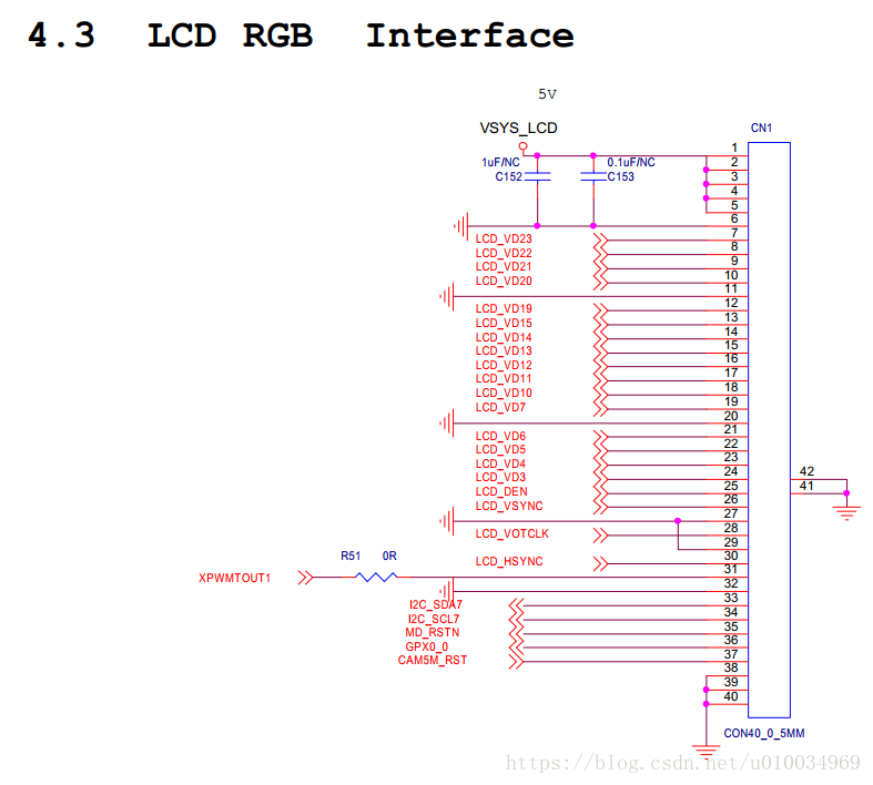 底板原理图上找LCD相关的部分,确定引脚网络标号。