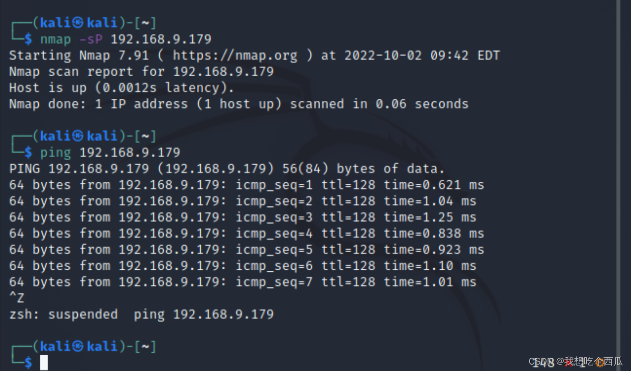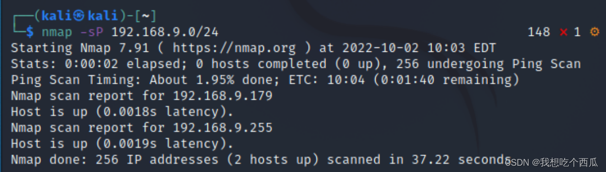 nmap在kali虚拟机中有集成,在cmd窗口中输入nume -sP IP地址: