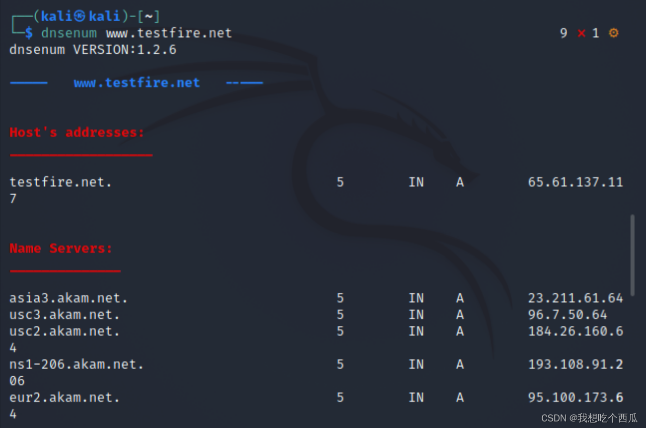 此外还有dnsenum命令,来获取域名对应的IP地址和整个访问过程中经历转发的服务器全部都显示出来。