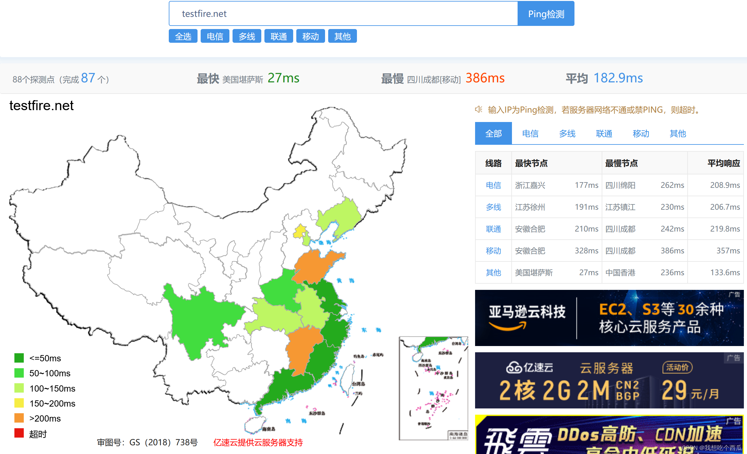 ( 站长工具 - 站长之家)网址中的热门工具中点击ping检测,也可以直接进入多个地点ping服务器-网站测速-站长工具