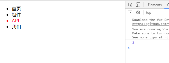 1 <!DOCTYPE html> 2 <html> 3 <head> 4 <meta charset="UTF-8"> 5 <title>vue</title> 6 <style> 7 .active { 8 color: red; 9 } 10 </style> 11 </head> 12 <body> 13 <div id="example"> 14 <ul > 15 <li v-for="(item, index) in navLists" :class="{active:changeRed == index}" @click="colorChange(index)">{{item.text}}</li> 16 </ul> 17 </div> 18 <!-- 开发环境版本,包含了用帮助的命令行警告 --> 19 <script src="https://cdn.jsdelivr.net/npm/vue/dist/vue.js"></script> 20 <script type="text/javascript"> 21 var vm = new Vue({ 22 el: '#example', 23 data: { 24 isActive: false, 25 navLists: [ 26 { 27 "text":"首页" 28 }, 29 { 30 "text":"组件" 31 }, 32 { 33 "text":"API" 34 }, 35 { 36 "text":"我们" 37 } 38 ], 39 changeRed : 0 40 }, 41 methods: { 42 colorChange: function(index) { 43 console.log(index) 44 this.changeRed = index; 45 } 46 } 47 48 }) 49 </script> 50 </body> 51 </html>